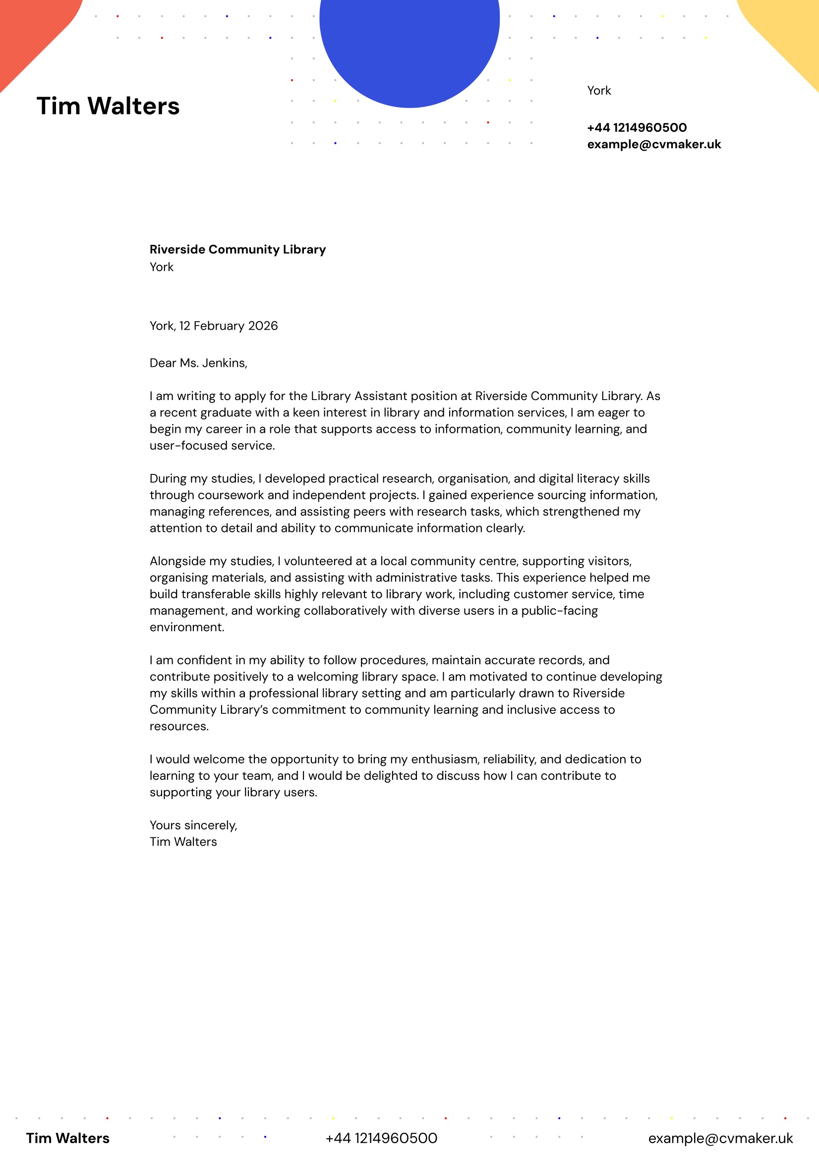 If you’re applying for an entry-level role such as a library assistant or trainee librarian, consider pairing your cover letter with a skills-based CV to emphasise organisation, communication, research, and interpersonal skills.