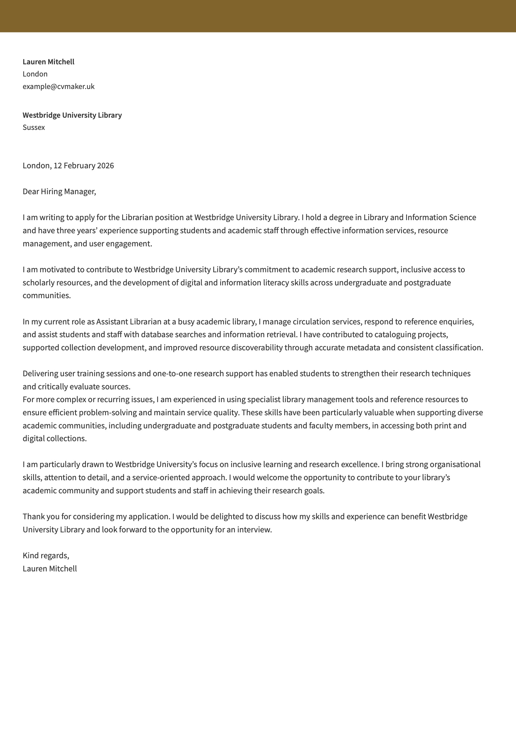 A strong librarian cover letter clearly links your experience in library and information services to the specific role. It shows how your organisational skills, research support, and technical knowledge add value to the organisation.